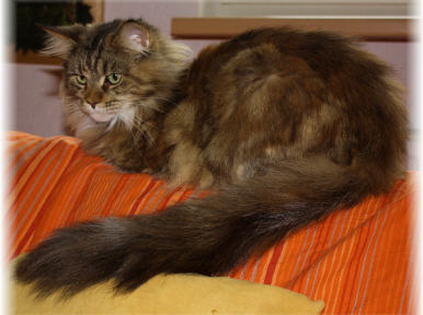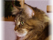 Sie hat eine wunderschöne Farbverteilung, deren Farbtöne an das Laub im Herbst erinnern. Mit ihren geheimnisvoll grün-glänzenden Augen. wickelt sie uns alle um ihre Pfote. Mittlerweile hat sie auch einen tollen Wildlook entwickelt. Sie ist ein großes Mädchen mit großen Ohren und schönen Tipp´s, ein XXl-Schwanz und eine tolle Schnautze, runden ihr schönes Aussehen ab. Sie hat ein sehr verschmustes, liebes, ruhiges Wesen.