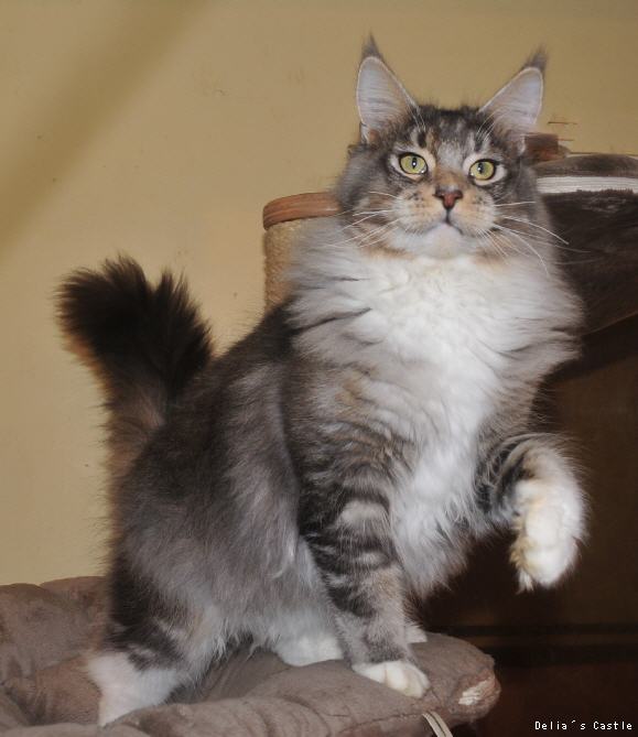 Er hat einen langgestreckten Körper mit XXL Schwanz und kräftigen Pfoten. Er ist ein großer, kräftiger Kater mit viel Fell in einer sehr guten Struktur. Ein starkes Kinn und ein exzellentes Profil mit einer hohen Stirn, dazu hohe Ohren mit Tipps zeichnen ihn aus.